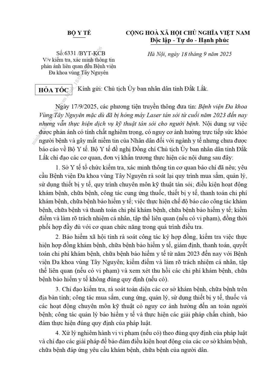 Ngày 18/9/2025, Bộ Y tế đã ban hành Công văn số 6331/BYT-KCB gửi Chủ tịch Ủy ban nhân dân tỉnh Đắk Lắk về việc kiểm tra, xác minh thông tin báo chí phản ánh liên quan hoạt động khám chữa bệnh tại Bệnh viện Đa khoa vùng Tây Nguyên. Đây là công văn hỏa tốc, thể hiện sự quan tâm đặc biệt của Bộ trước những thông tin nghiêm trọng được truyền thông nêu ra.